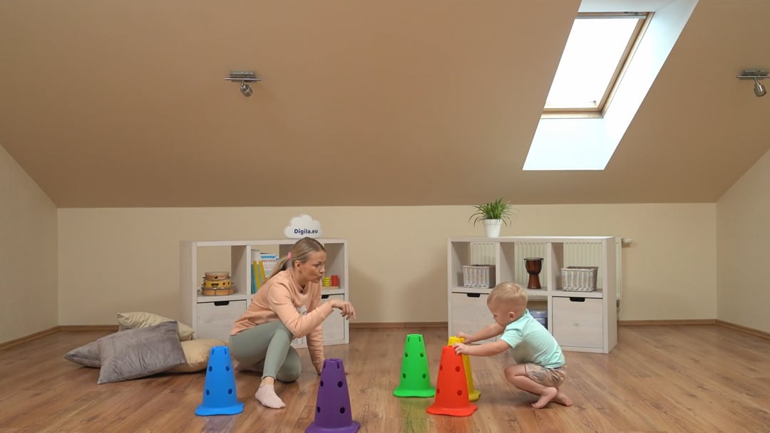 Kui ütlete „Start!“, laske lapsel koonuste vahel liikuma hakata nii, et ta neile vastu ei lähe. Kui ütlete „Stopp!“ laske lapsel kohe seisma jääda. Kui ütlete uuesti „Start!“, laske lapsel liikumist jätkata. Juhendage last tegevuse ajal ja lisage mängule erinevaid liikumisviise, näiteks hüppamine, aeglane ja kiire kõnd, rullimine – nii areneb lapse liikumisoskus. Kiitke last kindlasti osavuse ja kiire reageerimise eest.