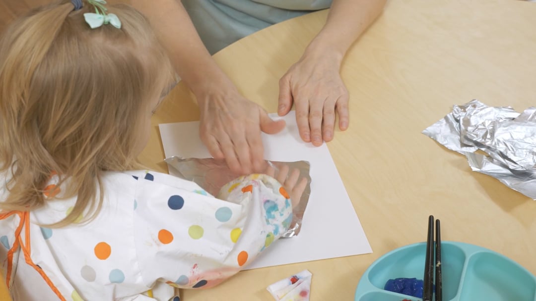 alustuseks laske lapsel fooliumiga tutvuda – tal seda kätega tunnetada. Seejärel näidake talle, kuidas pintsliga värvi fooliumile panna ning seal laiali ajada. Laske lapsel vabalt värvidega mäkerdada ja neid fooliumil segada. Kui tekivad uued värvused, siis juhtige lapse tähelepanu sellele, nii õpetate lapsele põhivärvide ja sekundaarvärvide segamise põhimõtteid. Et fooliumiga hiljem trükkida saaks, jälgige, et värvi oleks sellel pigem paksemalt. Kui laps on fooliumi värvimise lõpetanud, aidake tal aluspaber selle peale suruda. Laske lapsel paberit silitada ning vastu fooliumit vajutada. Seejärel eemaldage paber ja näidake lapsele, milline pilt välja tuli. Kui lapsel huvi püsib, tehke mitu pilti. Võite lapsel lasta värvi panna samale fooliumile, aga võite võtta ka uue. Tegevuse lõpus kaasake laps kindlasti ka korrastustöödesse.