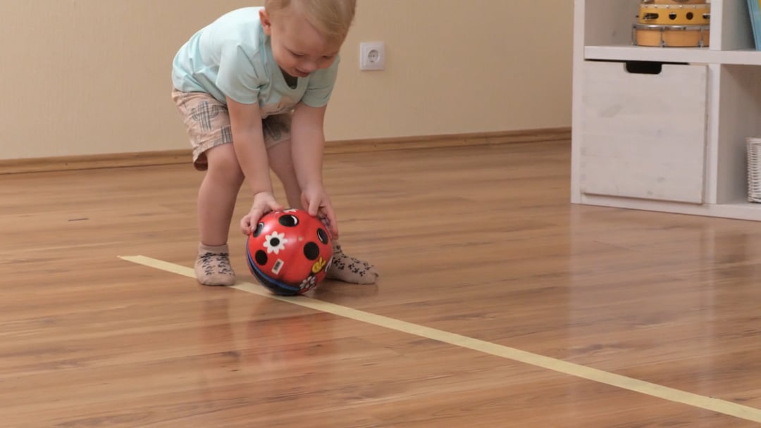 tõmmake põrandale pikad teibijooned. Joon võib olla nii sirge kui siksakiline, oleneb soovitud keerukusastmest. Joon peaks olema lapse jaoks piisavalt selgelt nähtav ja jälgitav. Pange valmis pall.