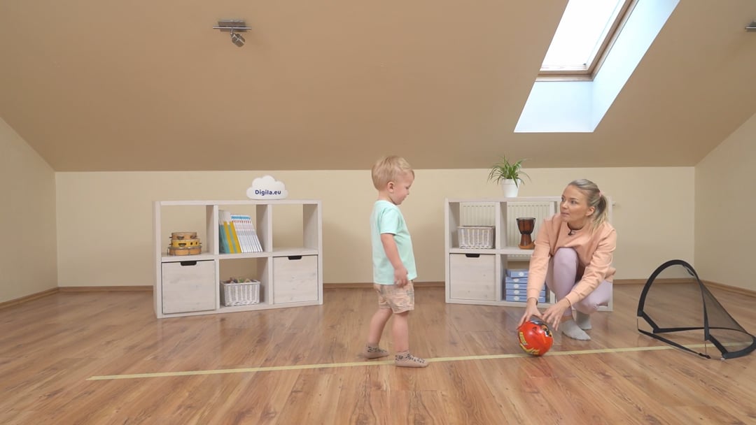 laske lapsel alustada rahulikus tempos kõndimist joone algusest ja astuda täpselt mööda joont ning proovida säilitada tasakaalu. Kui laps jõuab pallini, mille te olete värava ette asetanud, peab ta selle jalaga väravasse lööma. Nüüd julgustage last juba tempot tõstma, kas või näiteks jooksma, aga tuletage talle meelde, et ta samal ajal ikka joont jälgiks.