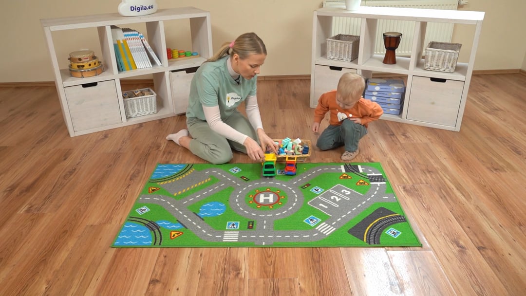 pange põrandale valmis autovaip, kastiautod ning klotsid vms, mida saab autoga vedada.