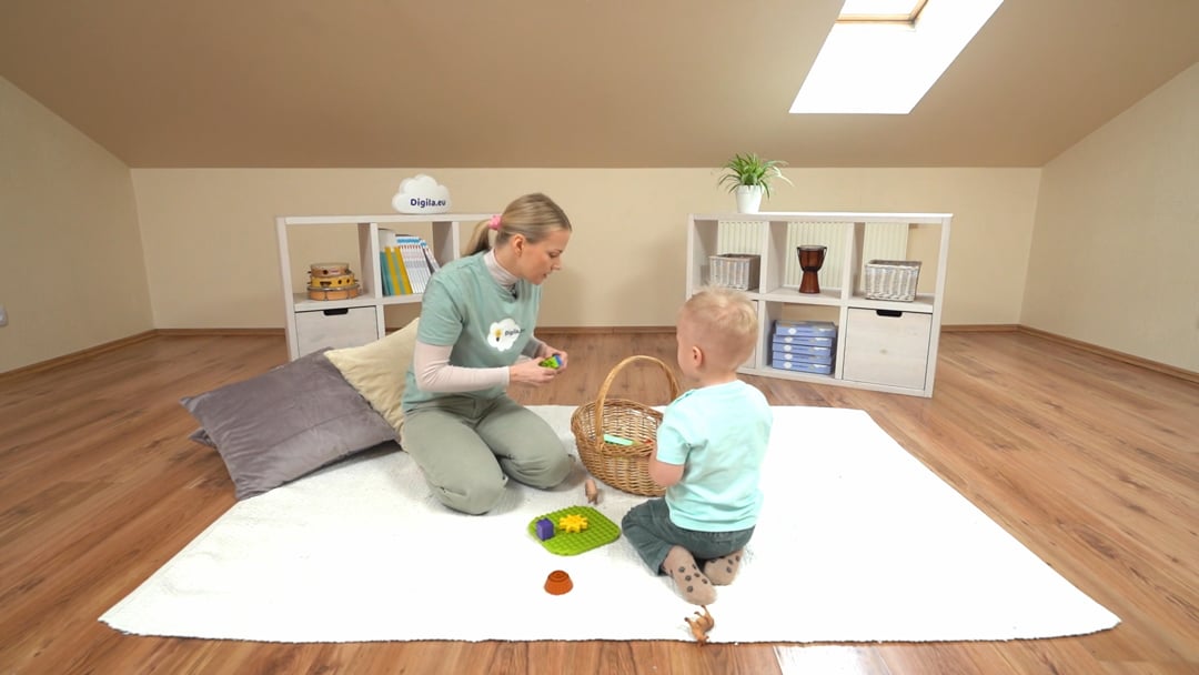 Laps paigutab juhendamisel esemeid üksteise sisse, peale, alla, ette, taha, kõrvale