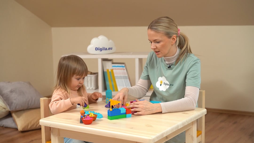 alustage klotsidest torni ehitamist ning küsige lapselt küsimusi, näiteks „Mitu klotsi sa torniks laod?“ ja „Mida sa ehitad?“. Pakkuge lapsele veel tegelasi, keda ta võiks ehitada ja kommenteerige mängu käigus oma tegevust – see laiendab lapse sõnavara ning innustab last mängus loovam olema. Jätkake tegevust seni, kuni lapsel selle vastu huvi on.