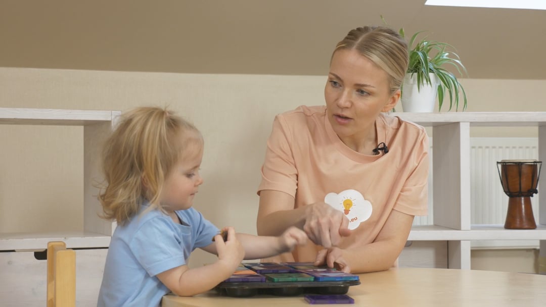 istuge lapsega põrandale või laua äärde ja laske tal magnetklotsidele koputada ja seejärel vaadata, kes seal all on. Laske lapsel leitud looma nimetada või kui laps veel ei kõnele, nimetage ise – nii laiendad tema sõnavara. Eesmärk on, et laps õpiks kasutama nimi- ja määrsõnu (nt „Kass siin!“). Öelge koos lapsega iga kord enne magnetklotsi avamist „Kop-kop, kes siin on?“ – see tekitab lapses ootusärevuse ning lisab põnevust. Selliseid mängulisi elemente kasutades on laps rohkem kognitiivselt kaasatud ja õpitu kinnistub paremini.