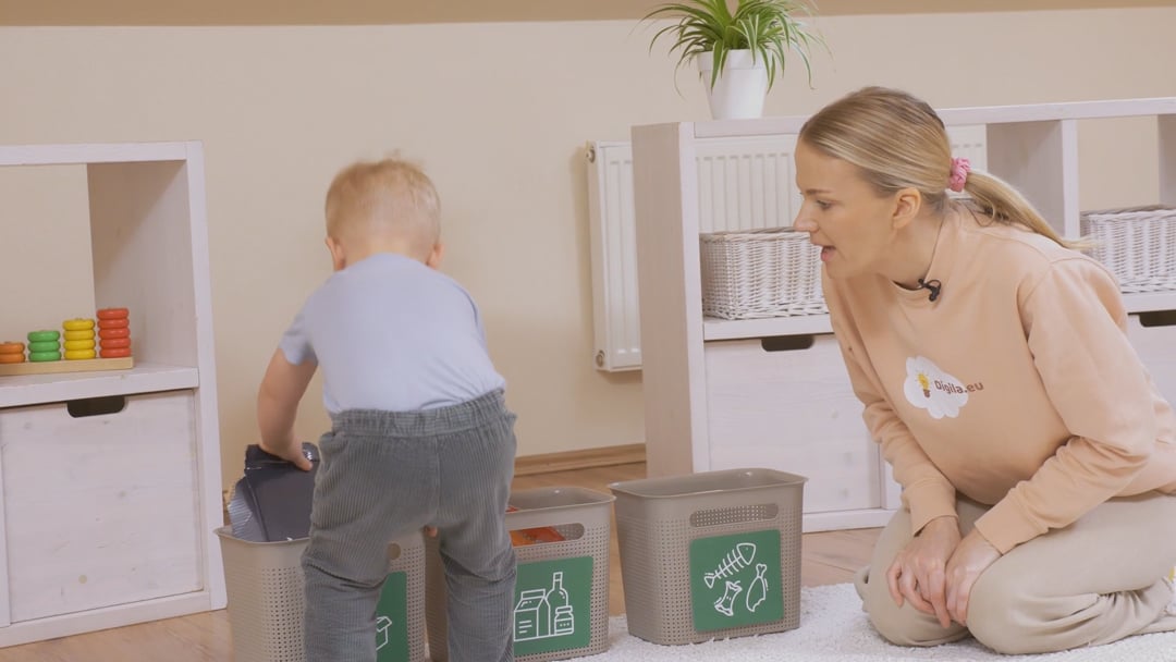 Rääkige lapsele: „Kas prügi tohib maha visata? Hakkame vaatama, kuhu me prügi panna saame. Me sorteerime selle prügi ära – sorteerima tähendab, et me paneme need erinevatesse kastidesse. Kõigepealt korjame kokku pudelid ja paneme ühte kasti. Siis korjame kokku paberid ja paneme teise kasti. Lõpuks korjame kokku toidujäätmed ja paneme kolmandasse kasti. Kui me paneme erineva prügi erinevatesse kastidesse, siis pudelitesse saab uue mahla panna, paberist saab uuesti sulle joonistamiseks paberit teha ja banaanikoori saab kasutada taimedele söögiks.“
