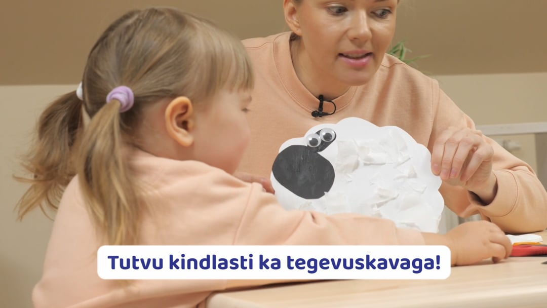 istuge lapsega koos laua taha ja näidake talle, kuidas paberist tükikesi rebida ning neid kartongist alusele kleepida. Laske lapsel enda eeskujul rebida ja kleepida, kuni kogu kartong on kaetud – lamba keha on valmis. Seejärel lõigake mustast paberist välja jalad ja nägu ning õpetage lapsele, kuidas need lamba keha külge kleepida. Viimasena lisage silmad.