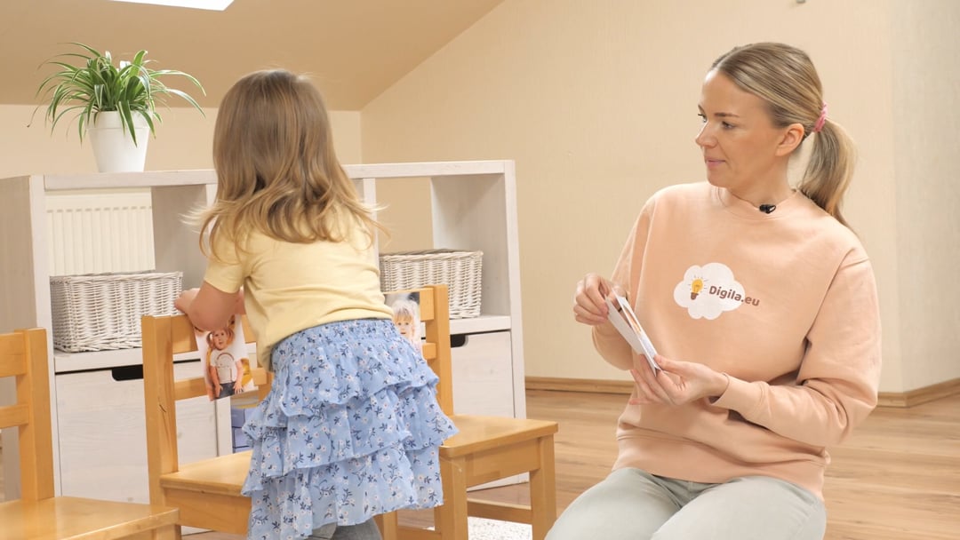 laske lastel toolidele istuda ja näidake neile järjekorras nende fotosid. Kui laps on ennast ära tundnud ja oma nime öelnud, sirutage käsi fotoga lapse poole ja pange foto selle lapse ette. Kui laps ei tunne ennast pildil ära, öelge ise lapse nimi ja andke talle foto. Kui kõigi nimed ja fotod on ühendanud, jätke fotod toolidele. Seejärel paluge lastel hakata ruumis lendama nagu linnukesed, hüppama nagu jänkud vms. Samal ajal vahetage laste piltide asukohad. Liikumise lõppedes paluge igal lapsel istuda sellele toolile, kus on tema pilt. Selline piltide asukoha vahetamine õpetab lapsele lihtsaid probleemilahendusoskusi ja ruumilist mõtlemist. Lõpuks küsige laste käest igal fotol oleva lapse nime.