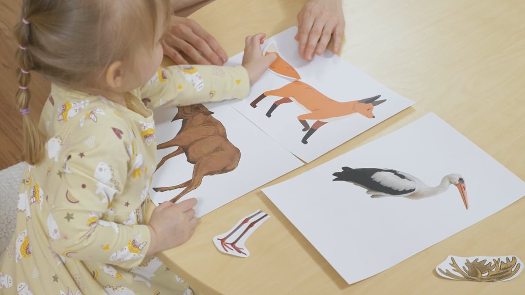 laske lapsel piltidega tutvuda. Nimetage loomi, kes on piltidel ja laske lapsel nendele osutada. Sama tehke puuduvate kehaosade piltidega – nimetage looma kehaosa ja laske lapsel osutada vastavale pildile. Seejärel laske lapsel igale looma või linnu pildile leida sellelt puuduva kehaosa pilt.