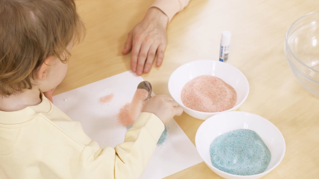 istuge lapsega põrandale või laua äärde. alustuseks tutvustage lapsele liimipulka – näidake, kuidas sellel kork ära käib ja kuidas saab liimi pikemaks keerata. Seejärel laske lapsel liimi paberile kanda nii, nagu ta joonistaks liimiga. Jälgige, et laps vajutaks liimipulgale piisava tugevusega, kuna liiga õrna liimikihi külge liiv ei jää. Kui laps on liimiga joonistamise lõpetanud, siis laske tal paberile liiva panna. Kui kogu paber on kaetud, kallake lahtine liiv madalasse anumasse ning uurige koos lapsega, mis paberile ilmus. Jätkeke tegevust seni, kuni lapsel selle vastu huvi on. Võite teha mitu kunstiteost.