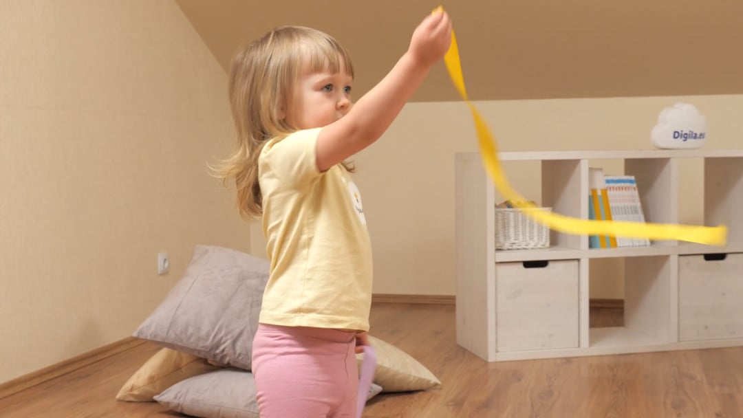 võtke lint enda kätte ja näidake lapsele, kuidas luua sellega õhus erinevaid mustreid. Seejärel andke lint lapsele. Pange muusika mängima, et laps saaks linti muusika saatel liigutada.