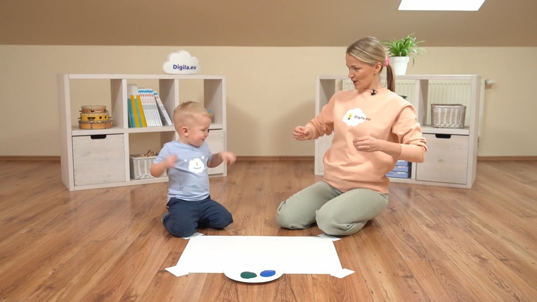 Seejärel suunake laps värvi ja paberi juurde. Alguses koputage paberile puhta sõrmega, seejärel tehke enda sõrm värviseks ning koputage sellega paberile. Julgustage last sama tegema. Laske lapsel sõrmega vihmapiisku paberile trükkida ja samal ajal soovi korral laulu korrata. Laske lapsel vabalt katsetada, lõpuks võib ta trükkida ka terve käega. Tegevuse lõppedes kaasake laps ka korrastamistöödesse.