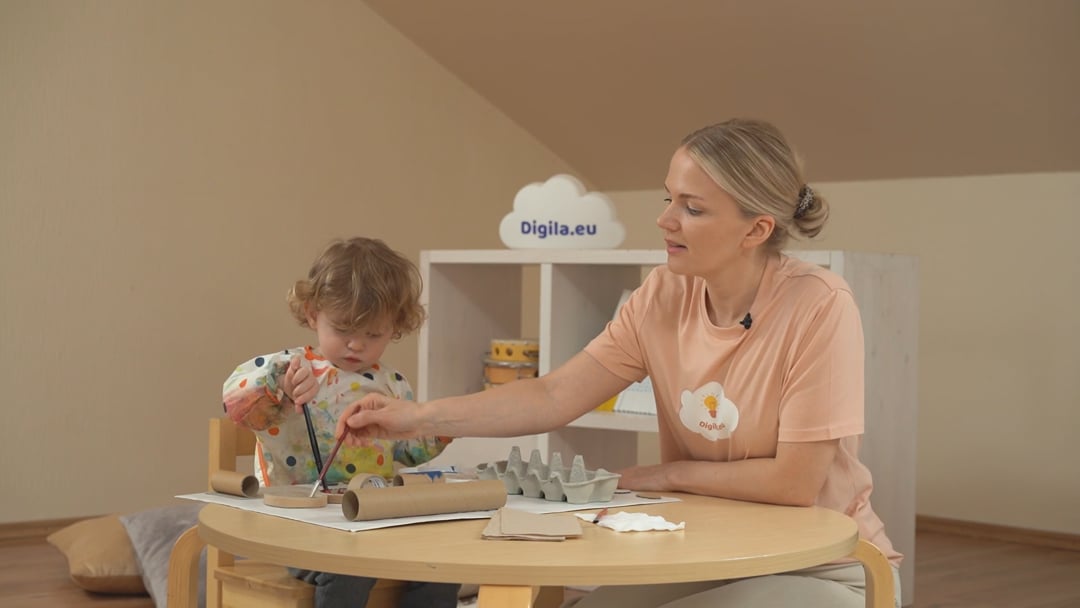 alustuseks selgitage lapsele, et ta peab papile liimitud erinevad pinnad värviga katma. Selle tegevuse käigus on teil võimalik toetada lapse sõnavara arengut ning innustada last enda tegevust kommenteerima. Kui laps veel ei räägi, siis kommenteerige ise, näiteks „Pane punast värvi rulli peale!“ jne. Tegevuse lõppedes kaasake laps ka koristustöödesse.