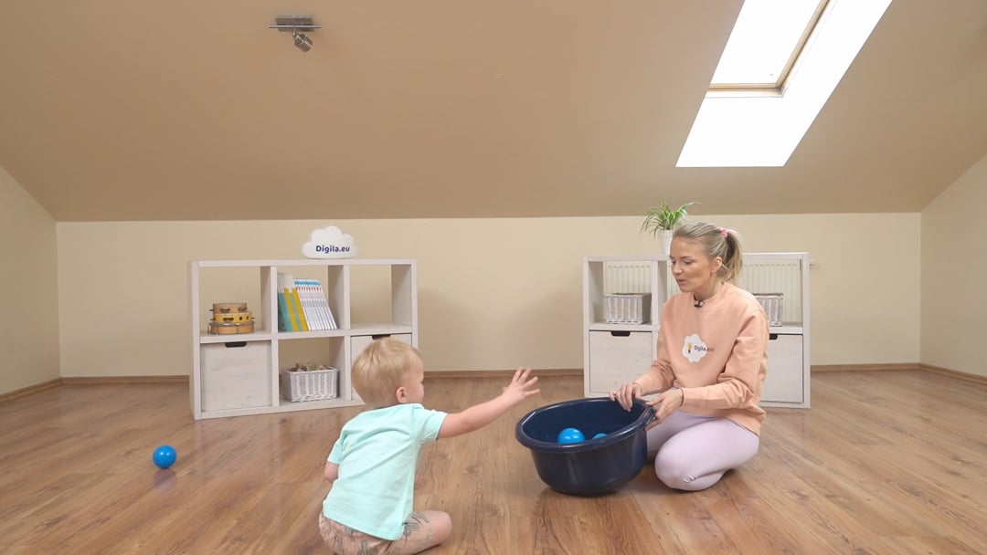 seiske tooli peale ja rääkige lapsele lugu sellest, kuidas külm tuul puhus ja puud õõtsusid. Seda öeldes õõtsutage ennast ja julgustage ka last sama tegema. Rääkige, kuidas taevast hakkasid langema vihmapiisad ning samal ajal tippige kikivarvul kohapeal ja laske lapsel sama teha. Seejärel hakake kätega plaksutades vihma häält simuleerima ja julgustage last sama tegema. Siis, kui laps on keskendunud vihmahelidele, tõstke pallidega täidetud nõu kõrgele õhku ja teatage, et nüüd hakkas rahet sadama. Valage pallid põrandale ning paluge lapsel need kiiresti kokku korjata ja tagasi ämbrisse panna.