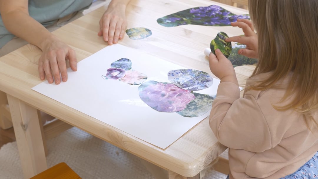 paluge lapsel valida üks kindel kategooria, näiteks lilled. Selgitage talle, et tema ülesanne on paberile kleepida ainult lilled. Juhendage last liimi pildi tagaküljele panema ja kujundeid paberile asetama. Kui lilled on kinnitatud, võite paluda lapsel valida teine kategooria, näiteks puud, ja lasta tal kleepida need teisele paberile. Tegevuse lõpus kirjeldage koos lapsega pilti.