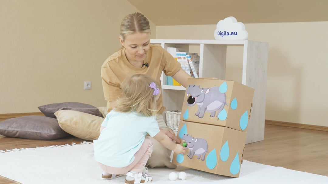 paluge lapsel suured pallid sorteerida suure jõehobu suhu ja väikesed pallid väikese jõehobu suhu. Kui laps alles tutvub suuruste sorteerimisega, siis julgustage last mängu käigus katsetama, näiteks „Proovi – suur pall ei mahugi väikese jõehobu suhu“.