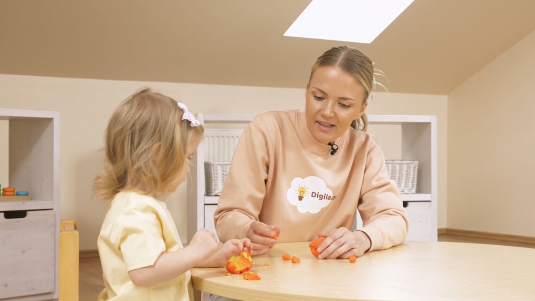istuge lapsega laua äärde ja alustuseks uurige voolimismassi lähemalt – laske lapsel sellega tuttavaks saada, seda pigistada, nuusutada jne. Seejärel näidake lapsele, kuidas veeretada palli. Kui laps on palli veeretamisega hakkama saanud, alustage selle tükeldamist. Oluline on, et laps saaks voolimismassist ise tükid kätte. Tehke erineva suurusega tükke ning veeretage need ka pallikesteks.
