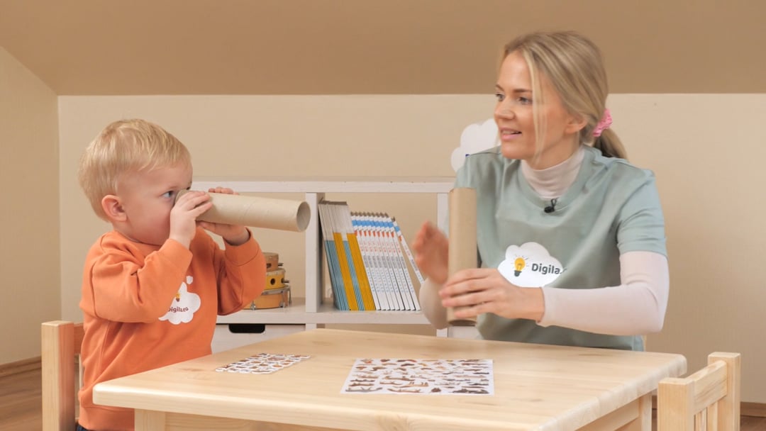 istuge koos lapsega põrandale. Näidake lapsele, kuidas läbi toru piiluda. Laske lapsel ka seda katsetada. Seejärel näidake talle, kuidas kleepse saab aluspaberilt eemaldada ja torule kleepida. Vajadusel aidake last kleepsu aluspaberilt kätte saamisel. Andke toru lapse kätte ja laske tal see kleepsudega kaunistada. Seejärel vaadake läbi selle erinevaid asju ning kasutage seda salajutu rääkimiseks, asetades toru lapse kõrva juurde ja sosistades ise sinna sisse.