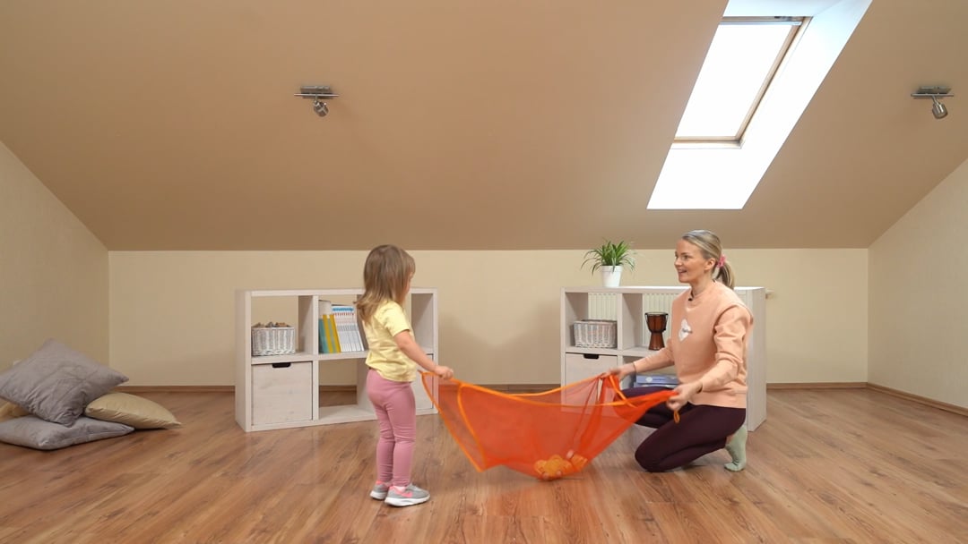 selgita lapsele, et hakkate popkorni tegema. Laps võiks teada, mis popkorn on, muidu võib tal olla keeruline mängu sisu mõista. Tõstke koos lapsega pallid riidele, võtke selle nurkadest kinni ja hüüdke: „Popkorni aeg!“ Liigutage lapsega koos käsi üles ja alla, et pallid hakkaksid riidel liikuma ja hüppama. Kui pallid maha kukuvad, siis on popkorn valmis. Korrake mängu seni, kuni lapsel huvi on.