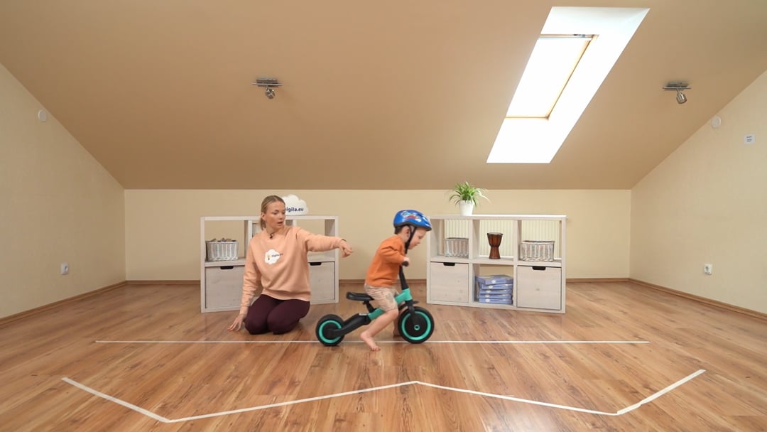 valmista ette jooksurattaga läbitav takistusrada. Tõmmake paberteibiga põrandale erinevaid trajektoore: sirgeid jooni, siksakke jne. Lisage ka mõned takistused, näiteks tool, mänguasjakast vms, mille ümbert saaks laps jooksurattaga sõita.
