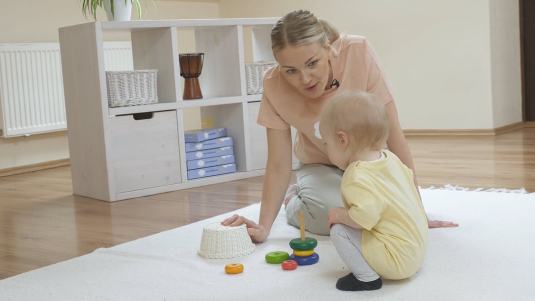 andke lapsele mängimiseks eri suuruses rõngastega rõngatorn ja näidake talle, kuidas rõngaid saab üksteise peale laduda ning laske lapsel ka ise loovalt mänguasju uurida. Kui laps rõngaste pulga otsa panemisest tüdineb, peitke rõngad topsi või kausi alla ja laske lapsel need üles leida. Seejärel laske lapsel rõngad ära peita – see aitab lapse tähelepanu pikemalt tegevuse juures hoida ning lapse keskendumisvõime areneb.