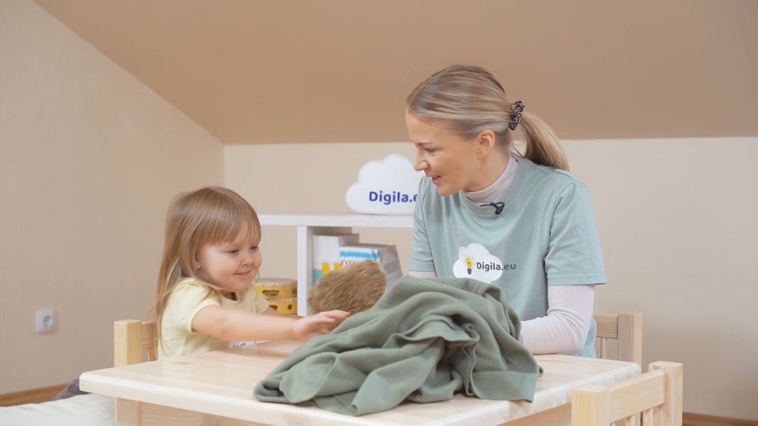 matkige siili turtsumist „tsh-tsh“ ja seejärel võtke siil riide alt välja ja öelge: „Siilil on kaks silma. Näita, kus sinu silmad on. Siilil on neli jalga. Kus on sinu jalad? Mitu jalga sul on? Siilil on üks suu. Kus sinu suu on? Siilil on kaks kõrva. Kus sinu kõrvad on? Siilil on üks nina. Kus sinu nina on? Siilil on okkad. Kas sinul on okkad?“ Tegevuse ajal loendage koos lapsega, et mitu jalga, silma tal on.