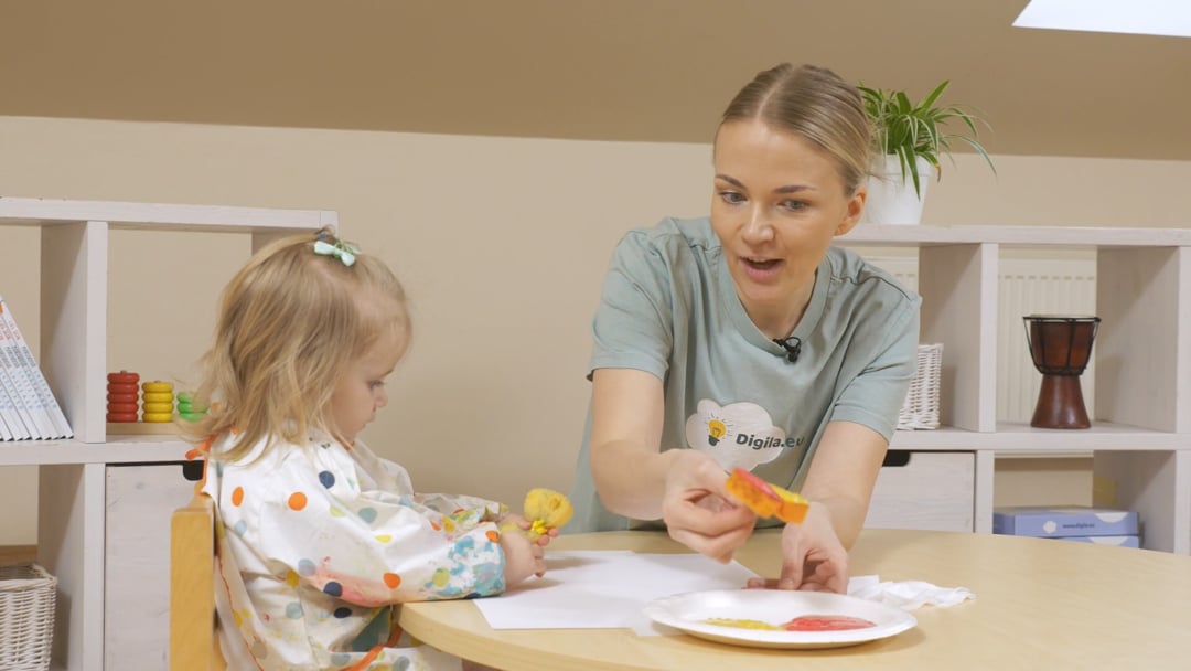valmistage svammidest liblikad – kinnitage svammide keskele nöör ja tõmmake see kõvasti pingule, et tekiks liblika kuju. Kõige parem on kasutada pehmemaid svamme. Pange lauale valmis värvialus värvidega, svammist liblikad ja kinnitage aluspaber paberteibiga laua külge.