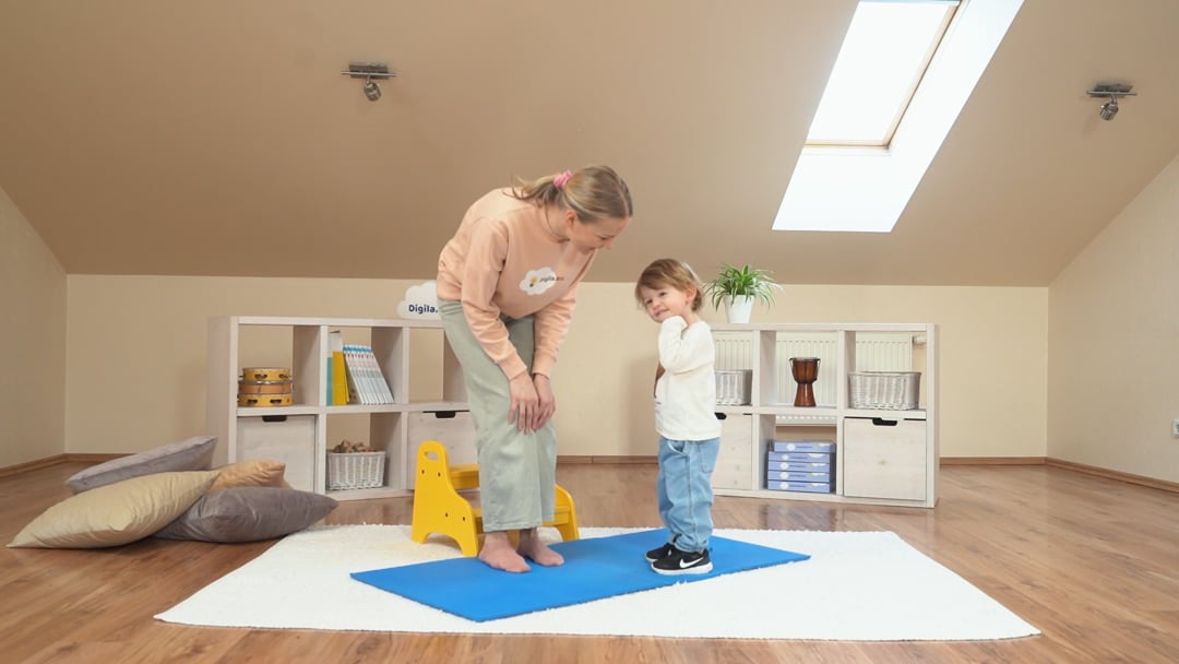 Laps kõnnib trepist üles ja alla juurdevõtusammuga ehk astub vahepeal mõlema jalaga samale astmele ning hoiab ühe käega juhendaja käest või käsipuust