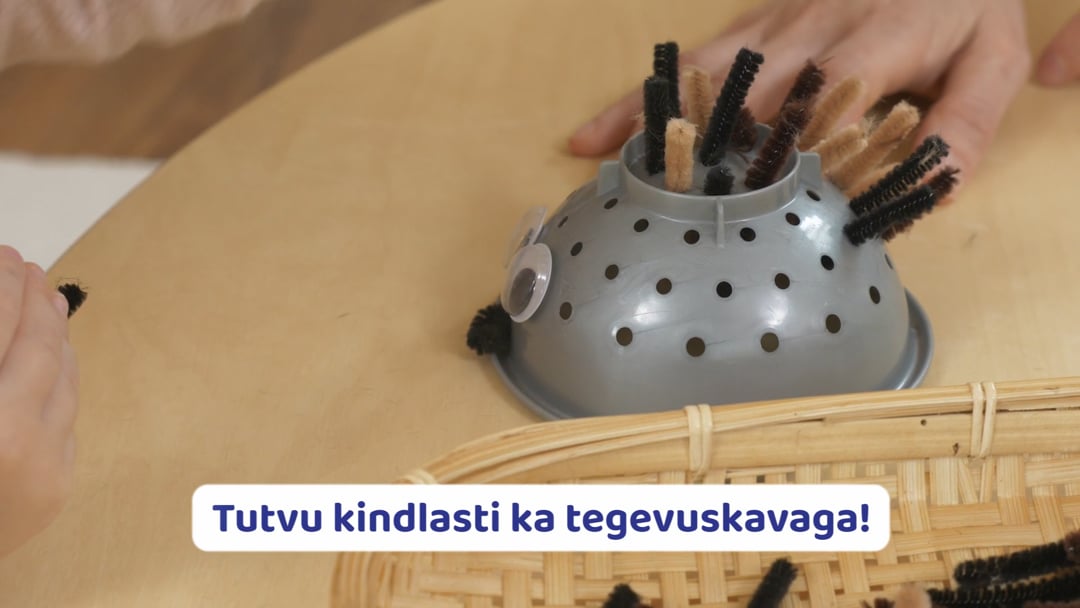 istuge lapsega laua äärde ja laske lapsel karvatraadid sõela aukudesse asetada nii, et need jääksid veidi sõela seest välja paistma nagu siili okkad. Soovi korral laske lapsel siilile ka nina ja silmad panna.