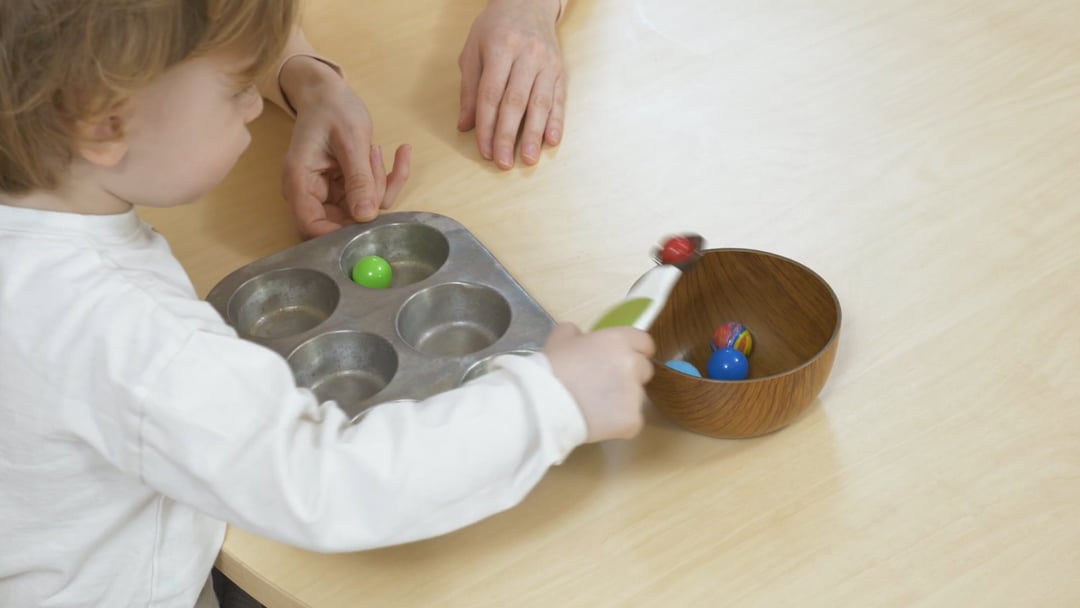 istuge lapsega laua äärde ja näidake talle, kuidas palle lusikaga muffinipannist kaussi tõsta. Seejärel andke lusikas lapse kätte ja laske tal teie tegevist jäljendada. Kui pallid on kausis, võite lasta lapsel need tagasi muffinipanni tõsta.