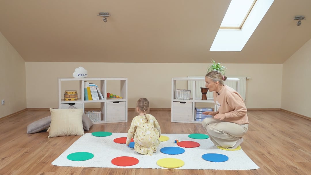 selgitage lapsele, mängureegleid ja seejärel veeretage täringut ning laske lapsel liikuda täringul näidatud värvile. Kasutage tegevuse kommenteerimisel ja lapse juhendamisel asukohta väljendavaid sõnu – siia, sinna, kaugele, lähemalt, seina äärde jne. Innustage ka last asukohta väljendama. Aktiivse tegevuse käigus omandatud teadmised on sügavamad ning püsivamad.