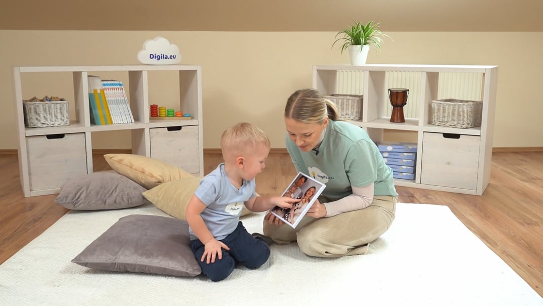 istuge lapsega põrandale ja vaadake koos fotot lapse perest. Rääkige lapsele, et pildil on tema perekond. Seejärel nimetage järgemööda kõik inimesed, kes pildil on. Võite teha nii, et laps nimetab ja osutab pildil inimesele või te ise nimetate inimese ja laps osutab temale. Rääkige iga pereliikme kohta, kes ta on, mida ta teeb ja mida ta lapsega koos tavaliselt teeb. Seejärel keskenduge detailidele (juuksevärv, riietus vms). Küsige lapselt küsimusi kõikide pereliikmete kohta ning laske tal aktiivselt vestluses osaleda.