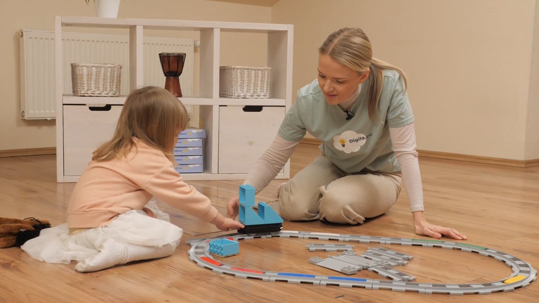 ehitage koos lapsega rongirada ning rong. Võite teha raja kõrvale ka erinevaid peatusi. Komplektis olevat rongi saab programmeerida värviliste klotsidega, mis tuleb rongirajale asetada. Öelge koos lapsega, mis värvi need klotsid on ning mida need teevad (punane klots jätab rongi seisma, valge klots paneb rongi tule põlema jne). Kui kõik on valmis, laske lapsel rong teele saata.