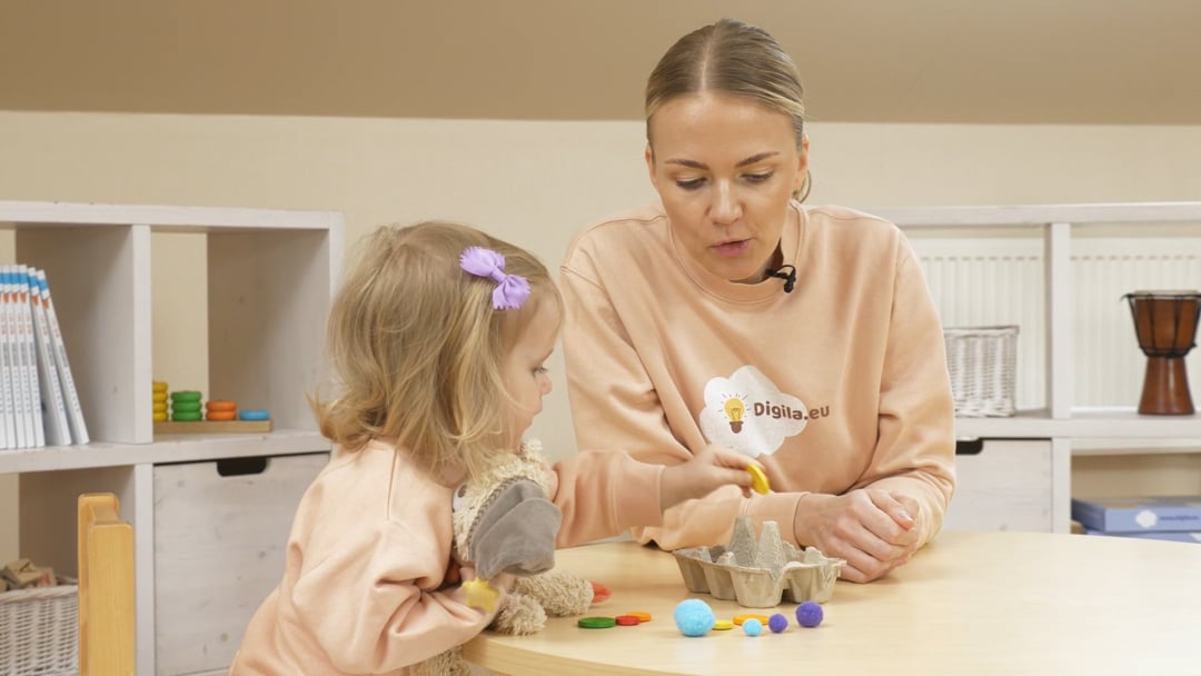 istuge lapsega põrandale või laua äärde ja alustuseks nimetage lapsele kõik värvid, mis munakarbil näha on. Seejärel laske tal alustada esemete sorteerimist. Kommenteerige tegevust ning aidake lapsel märgata sama värvi esemeid enda ümber. See aitab lapsel luua seoseid ning maailma tundma õppida, lisaks toetab see laps kõne arengut ning loovust – ta mõistab, et mängimiseks saab kasutada erinevaid esemeid.