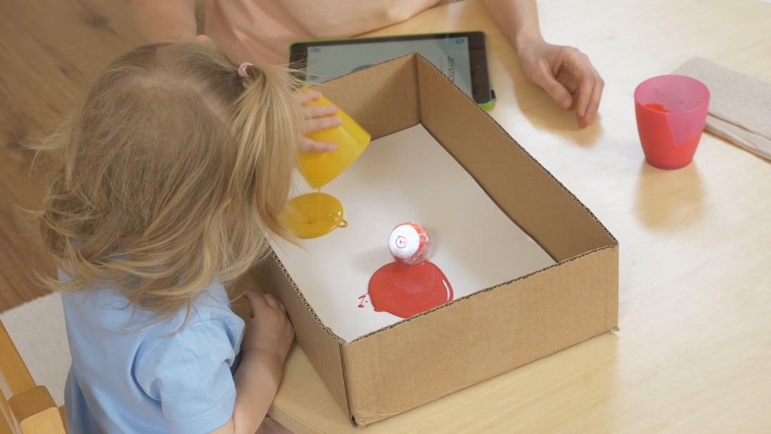 lisage koos lapsega kasti põhjas olevale paberile erinevat värvi guašše (värvi võiks olla veidi rohkem kui tavaliselt maalides). Seejärel lülitage nutiseadmest sisse Sphero Play äpp ning ühendage robotpalliga. Rakenduses saab lihtsasti näpuga ekraanil liigutades palli veerema panna. Asetage robotpall pappkarbi sisse ning paluge lapsel sellega värvide sees sõita. Võib-olla vajab laps teie abi näiteks nutiseadme hoidmisel. Kindlasti kommenteerige kogu tegevust ning jälgige, et roboti kasutamine oleks ohutu ja eesmärgipärane.