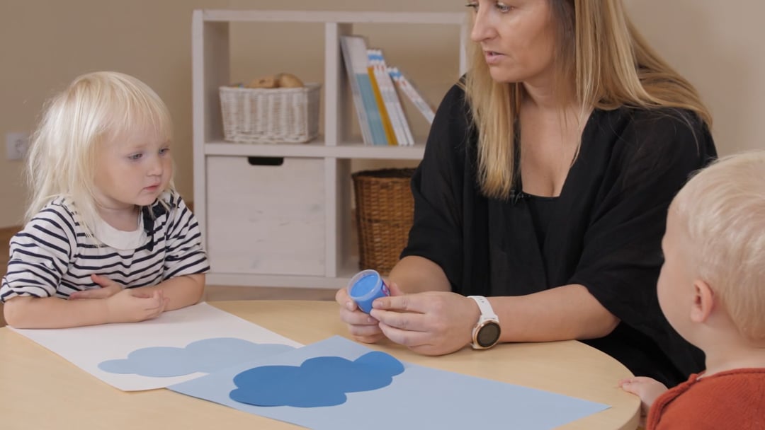 valmistage ette paber, millel on suur pilv. Pange lapsele selga riided, mis ei karda määrdumist ja katke laud soovi korral sobiva kattega, et hilisemat puhastamist lihtsustada. Teipige paber laua külge, siis ei pea laps muretsema, et paber paigast liigub. Pange lauale valmis pilvega paber ja värv.