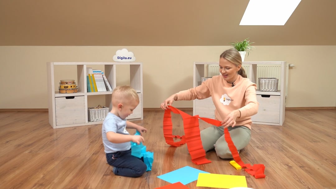 alustuseks istuge lapsega koos põrandale ja arutage, mis värvi pabereid teil on. Seejärel näidake lapsele ette, kuidas paberit rebida ja kortsutada ning julgustage teda enda eeskuju järgima. Kommenteerige tegevust ning korrake koos lapsega värvide nimetusi. Kui paberid on kortsutatud, tutvustage lapsele, kuidas vedelat liimi kasutada. Näidake ette, kuidas seda paberile panna ning laske lapsel ka katsetada. Seejärel leppige kokku, mis värvi paberid millisele aluspaberile kleebite ja alustage kleepimist. Pange tilk liimi aluspaberile ning vajutage värviline paber selle peale. Laske lapsel sama teha. Lõpuks korrake lapsega üle nende värvide nimetused, mida kasutasite ja riputage töö seinale.